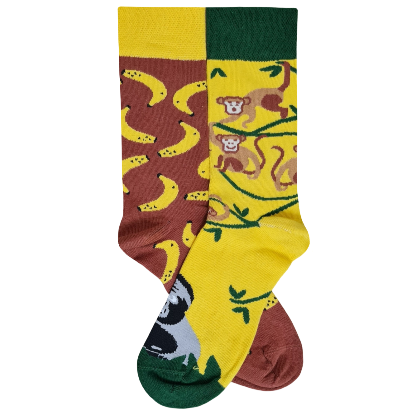 Fun and quirky mismatched socks ๐ต๐ One sock features playful monkeys and gorilla, the other sock has a cheerful banana pattern. Soft, comfy, and perfect for adding a whimsical, playful touch to your outfit ๐งฆโจ